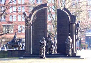 10 Euro Münze, 2 Briefmarken und das Denkmal "Göttinger Sieben" in Hannover (von Floriano Bodini 1998) >> kulturreise-ideen.de - Grimm Sehenswürdigkeiten in ganz Deutschland