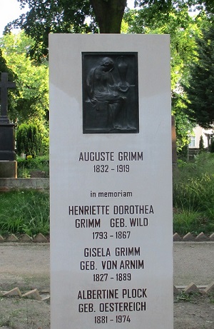![]() Am Friedhofseingang am 26. Juni 2016 eine kleine Ausstellung zur Familie Grimm ![]() Zu den Inschriften: Wilhelm und Dorothea Grimms Tochter Frl. Auguste Luise Pauline Marie Grimm (1832 -1919) wurde als Urenbeisetzung im Grab des Vaters beerdigt. Kurz nach dem ersten Weltkrieg und ohne wirkliche Erben ist es leider nicht zu einer Grabinschrift gekommen. Ihre Mutter Henriette Dorothea Grimm, geb. Wild (1793 - 1867) verstarb bei einem Besuch bei Burghauptmann Bernhard von Arnswaldt und wurde in Eisenach bestattet. 1859 heiraten Herman Grimm und Gisela von Arnim, (1827 - 1889), die auch schon mit ihrer Mutter Bettina von Arnim Märchen verfasste, starb auf der Rückreise einer Kur in Italien und ist in Florenz bestattet worden. Albertine Plock, geb. Oestereich (1881 - 1974): Durch das uneheliche Verhältnis des zweiten Sohnes von Wilhelm Grimms, Rudolf, mit der im Grimmschen Hause tätigen Haushälterin Agnes Oestreich wurde 1881 eine Tochter geboren, die später den Lehrer Otto Heinrich Plock aus Althaldensleben heiratete. Albertine erhielt durch die Familie Grimm eine gute Erziehung, besuchte das Lyzeum und absolvierte anschließend eine Lehrerinnen-Ausbildung in Magdeburg. Sie war in der Folgezeit 1901–02 in Hötensleben sowie 1902–06 an der Volksschule in Althaldensleben als Lehrerin tätig (Aus dieser Verbindung gibt es bis heute leibliche Nachfahren der Brüder Grimm, die jedoch nicht mehr den Namen Grimm tragen). Als das letzte direkte Mitglied der Familie Grimm übernahm sie als letzte mögliche Erbin den größten Teil des Nachlasses Wilhelm Grimms. Jahrzehntelang wurde dieser Nachlaß über Kriegs- und Nachkriegszeiten hinweg von ihr sicher und vollständig aufbewahrt. 1963 schenkte sie ihn dem Museum in Haldensleben mit dem Wunsch, daß er dort insgesamt ordnungsgemäß verwaltet, pfleglich behandelt und der Öffentlichkeit zugänglich gemacht wird. Zum Nachlaß gehören u. a. 1884 Bücher, Ergebnisse künstlerischen Schaffens, zahlreiche Inventaren und mannigfaltige persönliche Gegenstände. Dazu kommen Kleinmöbel, Porträtbüsten, Gebrauchsgegenstände und Kleidungsstücke. Hierzu gehören die Standuhr und der Galafrack Jacob Grimms sowie eine Eckvitrine aus dem Arbeitszimmer Wilhelm Grimms. Wertvolle Kunstwerke aus dem Besitz Herman Grimms sind ein die Jungfrau Maria darstellendes Keramikrelief aus dem 15. Jahrhundert und eine 1848 von Carl Hassenpflug geschaffene Alabasterbüste Gisela von Arnims. >>